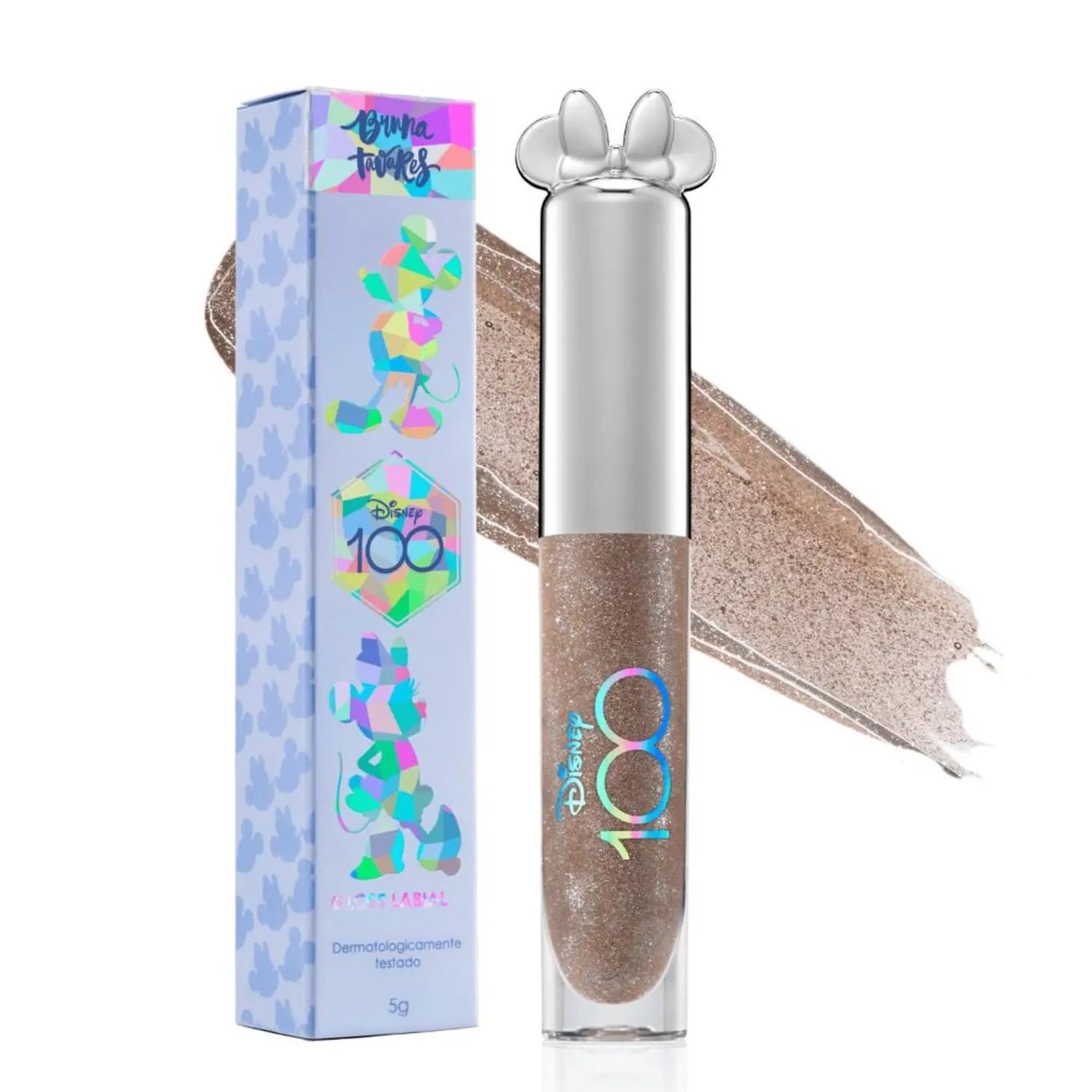 Gloss labial. Bruna Tavares Disney 100 realça seus lábios com um brilho intenso e radiante, que pode ser usado sozinho os por cima do batom.O Gloss Labial Bruna Tavares Disney 100 possui uma embalagem especial com as orelhinhas em prata da Minnie. Além disso, possui uma fórmula exclusiva que combina brilhos variados e tem uma textura glossy que adere aos lábios sem escorrer. Um verdadeiro artigo de luxo para compor seus produtos de maquiagem!
