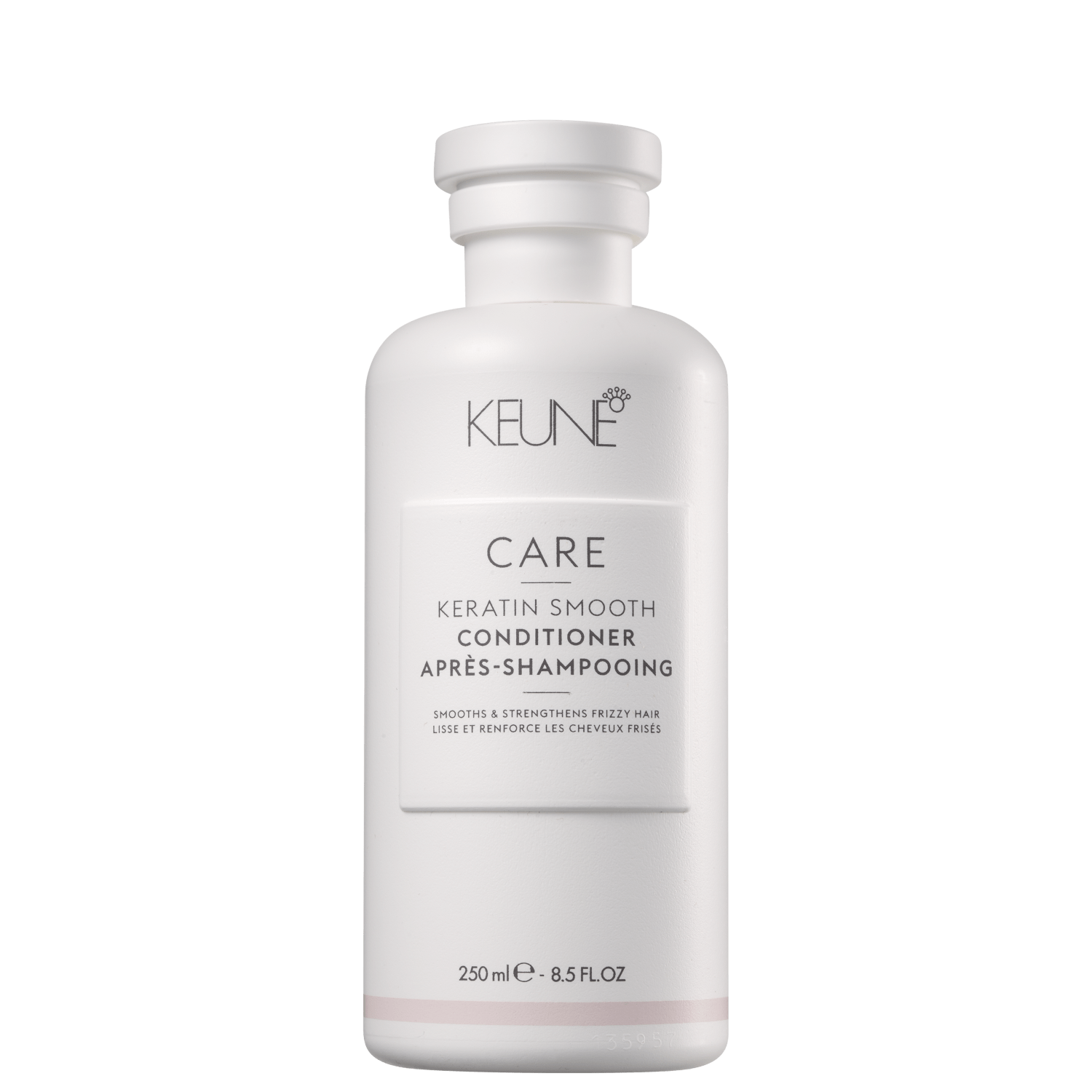 Condicionador para cabelos com química. Keune Care Keratin Smooth Conditioner restaura e protege contra frizz e quebra os fios sensibilizados, por repor nutrientes e proteínas essenciais. Keune Care Keratin Smooth Conditioner devolve a queratina perdida em processos químicos, como alisamentos definitivos ou mechas, reestruturando a fibra capilar, devolvendo força e brilho aos fios. Também protege o cabelo do calor e agressões com a formação de um filme protetor.
