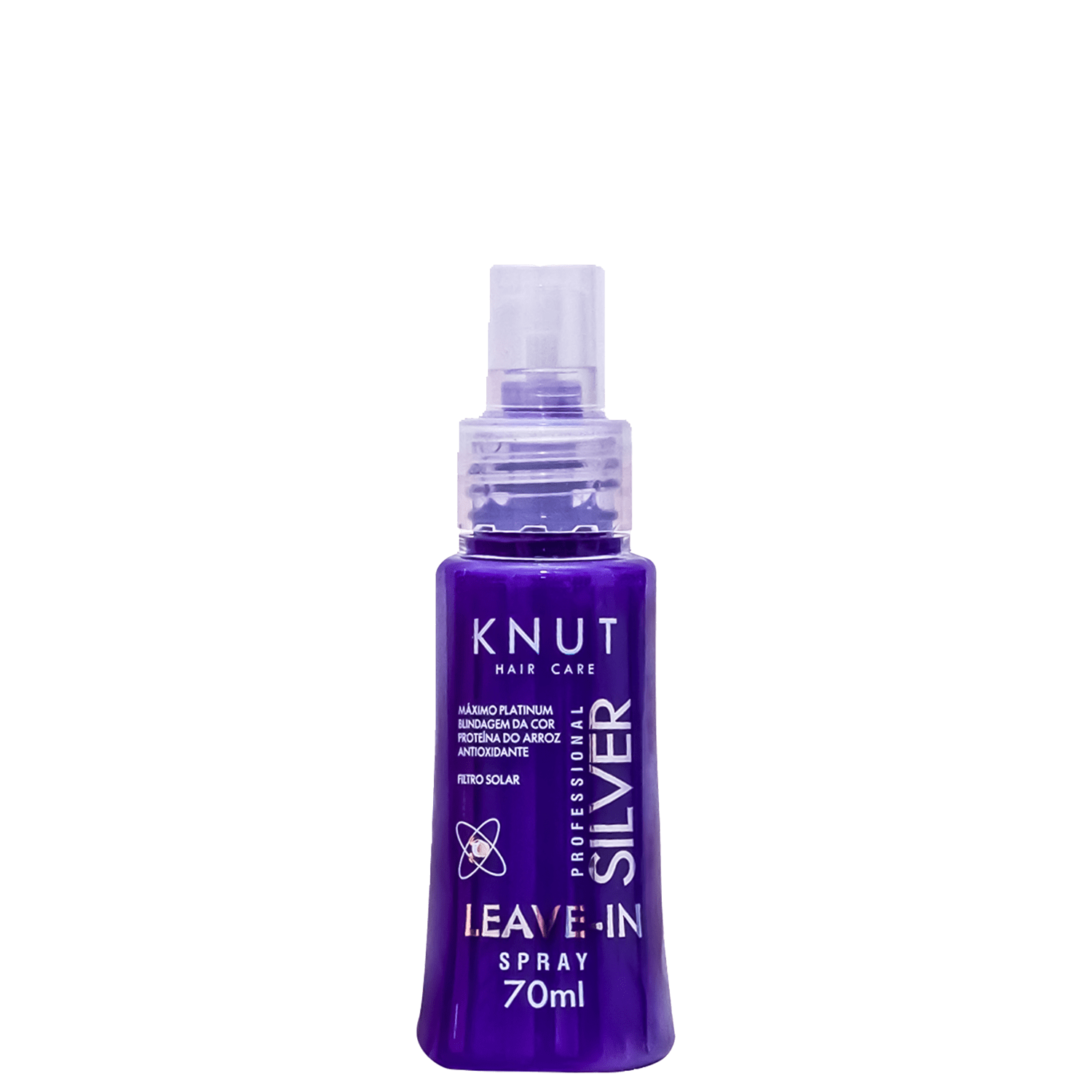 Spray leave-in matizador para cabelos loiros, brancos ou com mechas. Knut Silver Leave-in Spray protege dos fios da mudança de cor enquanto facilita o pentear e minimiza os danos causados pelo calor do secador.Knut Silver Leave-in Spray blinda o tom platinado no cabelo para que as químicas e agressões térmicas não alterem a cor. Também possui filtro solar e propriedades antioxidantes que combatem o envelhecimento precoce dos fios. Assim, você conquista um cabelo com efeito platinado bonito e duradouro.