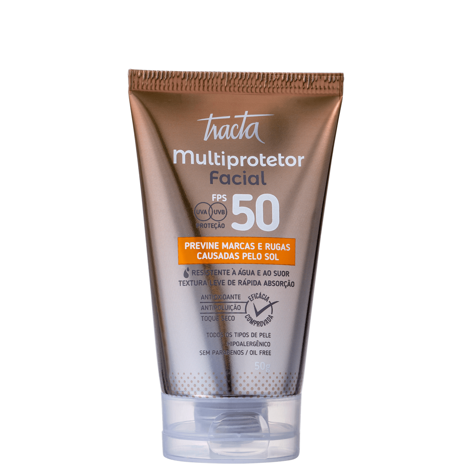 Protetor solar para todos os tipos de pele. Com textura leve e oil free, Tracta Multiprotetor FPS50 protege contra os raios UVA e UVB, proporciona efeito matte e é resistente ao suor. Protetor Solar Tracta Multiprotetor FPS50 ainda possui ação antioxidante, clareadora, firmadora, antienvelhecimento e antipoluição. De rápida absorção, é recomendado para prevenir manchas, rugas e linhas de expressão causadas pela exposição solar.